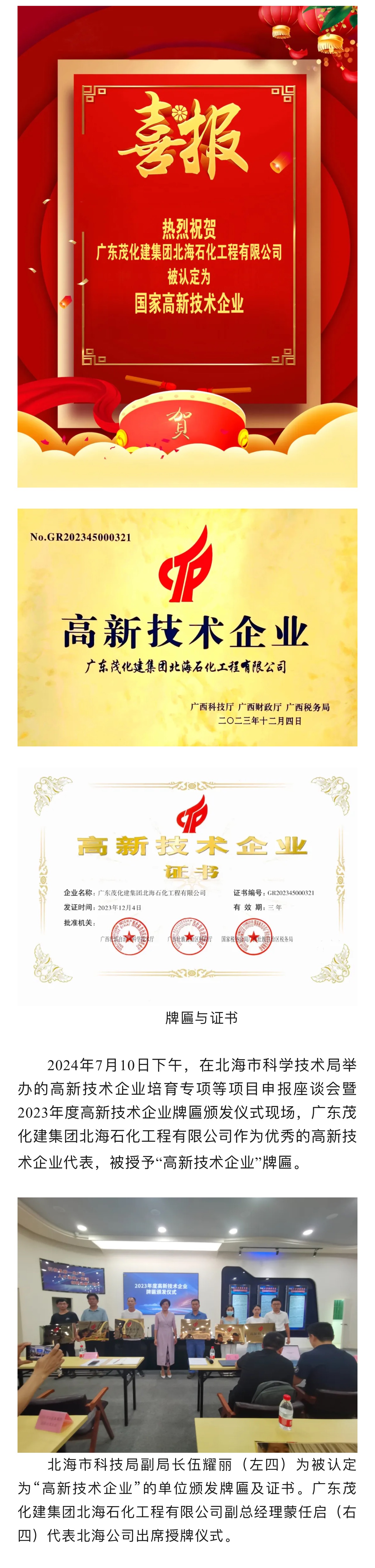 喜報(bào)|廣東茂化建集團(tuán)北海石化工程有限公司 躋身“國(guó)家高新技術(shù)企業(yè)”行列