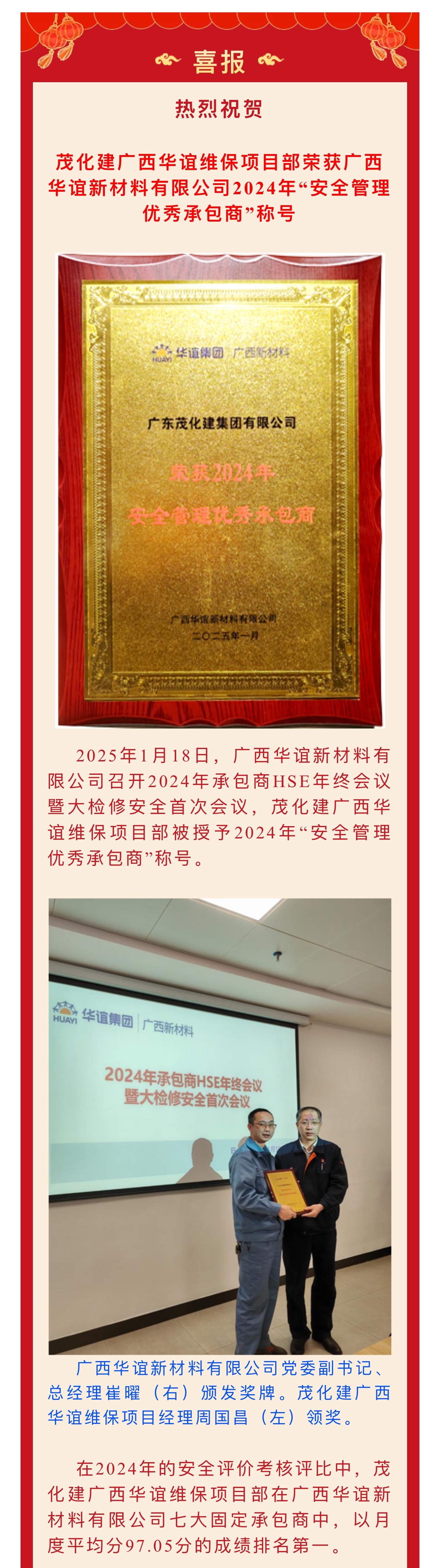 喜報(bào)|榮獲廣西華誼2024年“安全管理優(yōu)秀承包商”稱號(hào)